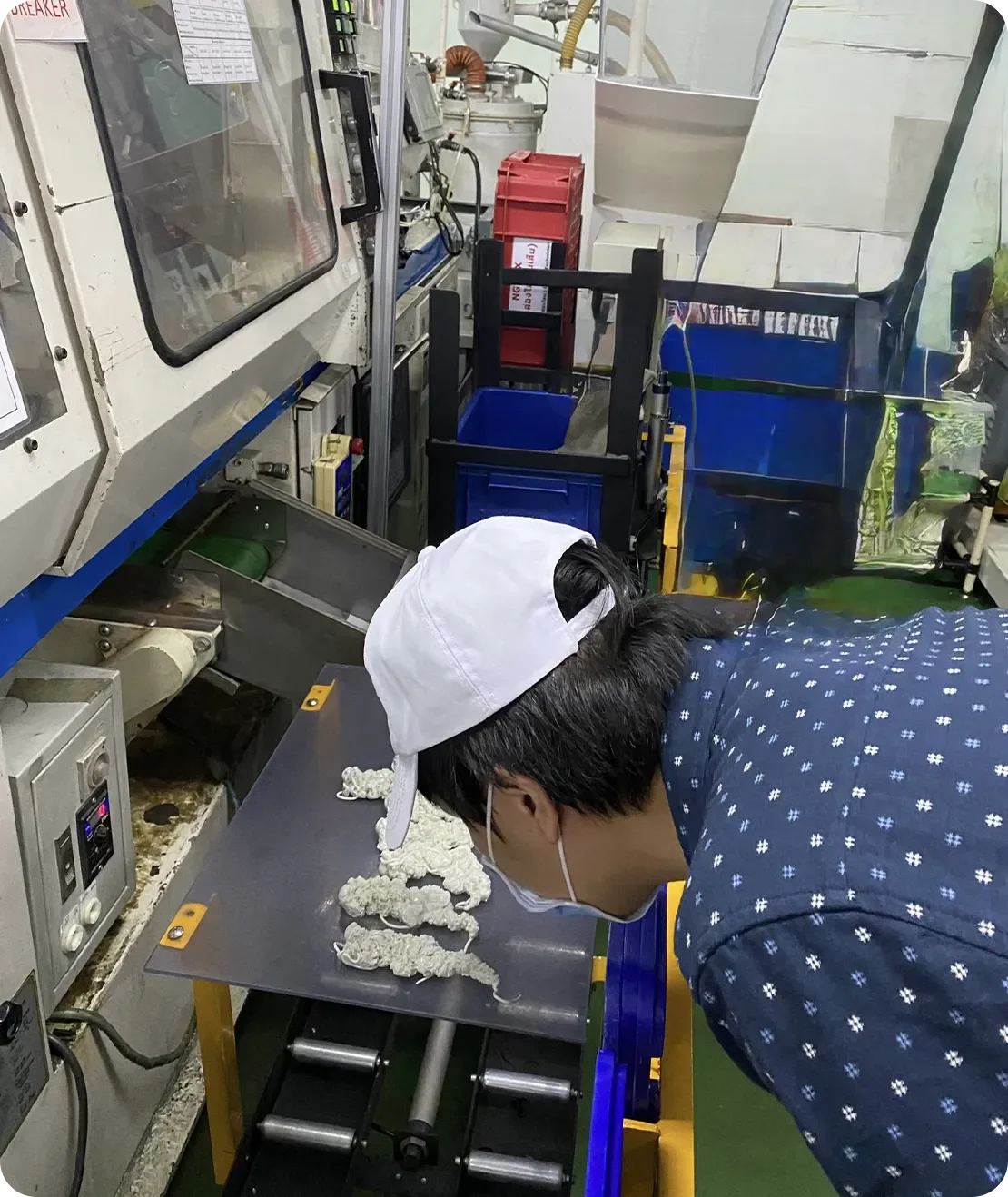 หมายเหตุ: Short Purge คือการฉีด ปริมาณน้อย และ ความเร็วสูง ซ้ำ ๆ ตัวอย่าง เช่น สำหรับเครื่องฉีด 80 ตัน ให้ตั้งปริมาณฉีด (Shot size) 15 มม. และเพิ่มความเร็วจากปกติ 100 มม./วินาที เป็น 120-150 mm/วินาที โดยความเร็วรอบ (RPM) และอุณหภูมิ ให้คงไว้เท่าเงื่อนไขการขึ้นรูปของวัสดุก่อนหน้า